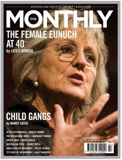 So it is with this new approach to feminism that I have that I read Louis Nowra’s article on Germaine Greer in The Monthly magazine in April. I was shocked, horrified and disgusted for a few reasons. The Monthly’s attitude to its demographic was one thing. Clearly the thought is that their readers are male and of a certain age. Secondly that it got the front cover when it is flanked either side by investigative reports from some of Australia’s premier journalists, Margaret Simons and Mandy Sayer. Both articles used thorough research, had an argument and both ran rings around Nowra’s ridiculous piece. In particular it was these tracts that got my blood boiling: