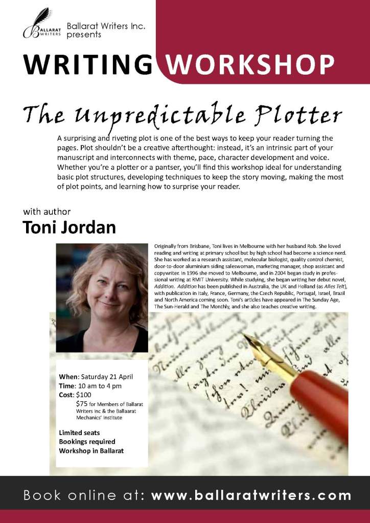 April 10, 2012 by Melissa Watts Toni Jordan on Plotting Uncategorized Leave a comment Toni Jordan will be joining Ballarat Writers, Saturday April 21, to run a workshop on plotting. Click here for details and bookings. Share this: Click to share on X (Opens in new window) X Click to share on Facebook (Opens in new window) Facebook Click to share on Pinterest (Opens in new window) Pinterest Click to email a link to a friend (Opens in new window) Email More Click to share on Reddit (Opens in new window) Reddit Click to share on LinkedIn (Opens in new window) LinkedIn Click to print (Opens in new window) Print Click to share on Tumblr (Opens in new window) Tumblr Click to share on Pocket (Opens in new window) Pocket Like Loading... Related