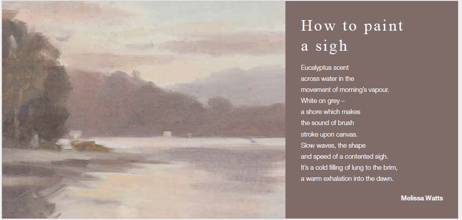 I loved the title of this poem from the start – how does artist evoke a sigh? Both artist and poet create a wonderful serenity; the poet develops this by references to the senses, imagining the soft sound of the artist’s brush on canvas, the scent of the eucalypts. This work is an excellent example of an ekphrastic response.
